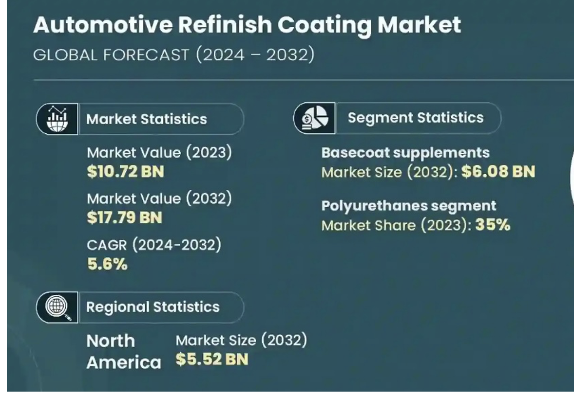 Accoridng to a new report from Global Market Insights, the Automotive Refinish Coating Market was valued at approximately $10.72 billion in 2023 and is projected to indicate a CAGR of over 5.6% from 2024 to 2032. The surge in demand for automotive refinish coatings is primarily attributed to the rising number of vehicles on the road, especially older ones that necessitate maintenance and repairs. Furthermore, the market is bolstered by an increasing consumer inclination towards vehicle customization and aesthetics, alongside the burgeoning popularity of used cars, which frequently require refinishing. Technological advancements in coatings, emphasizing enhanced durability and environmental benefits, are also propelling market growth.
