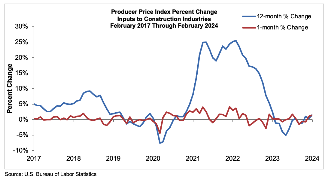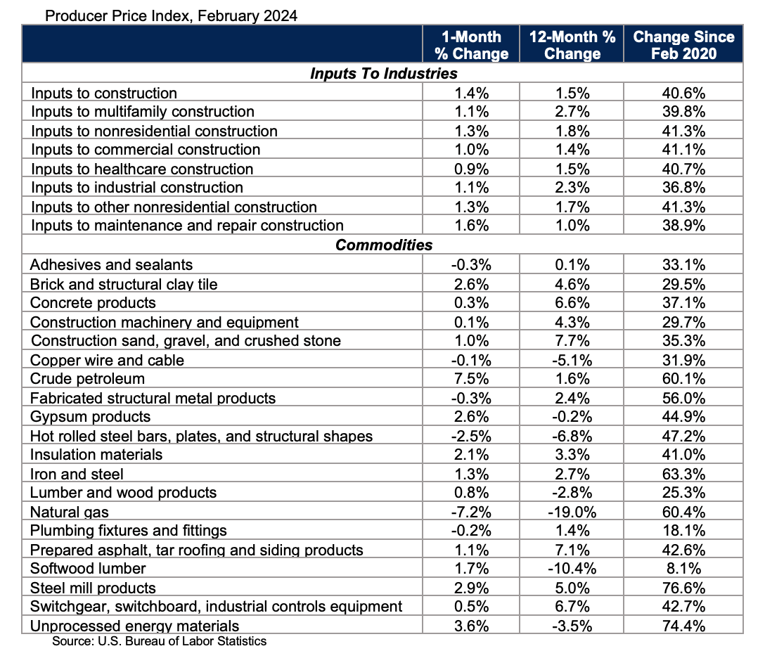 Construction input prices increased 1.4% in February compared to the previous month, according to an Associated Builders and Contractors analysis of the U.S. Bureau of Labor Statistics’ Producer Price Index data recetnly released. Nonresidential construction input prices increased 1.3% for the month. Overall construction input prices are 1.5% higher than a year ago, while nonresidential construction input prices are 1.8% higher. Prices increased in 2 of the 3 energy subcategories last month. Crude petroleum input prices were up 7.5%, while unprocessed energy materials were up 3.6%. Natural gas prices declined 7.2% in February. “For the last several weeks, inflation data have been coming in hotter than anticipated,” said ABC Chief Economist Anirban Basu. “This was also true for the February construction input price data, which indicated that upward price pressures are reemerging after a period of calm. Monthly inflation was apparent in several categories, including brick/tile, gypsum and steel mill products. With supply chains around the world rattled by military conflicts and other phenomena and workers’ wages far higher than they once were, there is reason to believe that inflation will remain stubbornly high for months to come. “For contractors, today’s release is bad news for at least two reasons,” said Basu. “First, higher input prices implicate lower demand for construction services all else equal. With project financing costs already elevated, project owners are less likely to move forward with construction work given already high and rising input costs. “Second, recent inflation data render it more likely that interest rates will remain higher for longer. For weeks, the conventional wisdom has been that the Federal Reserve was poised to reduce interest rates. Today’s inflation data, along with other releases, suggest that hopes for rapidly declining rates were somewhat premature.” Visit abc.org/economics for the Construction Backlog Indicator and Construction Confidence Index, plus analysis of spending, employment, job openings and the Producer Price Index.