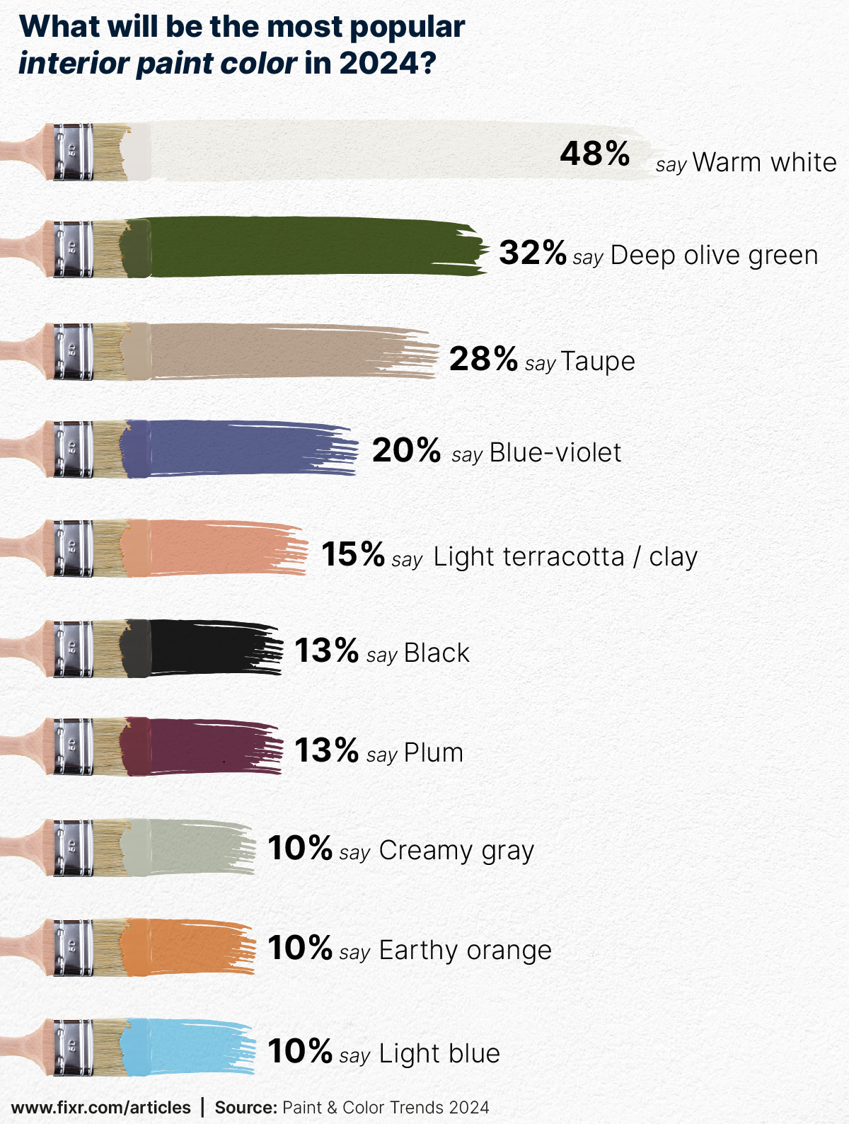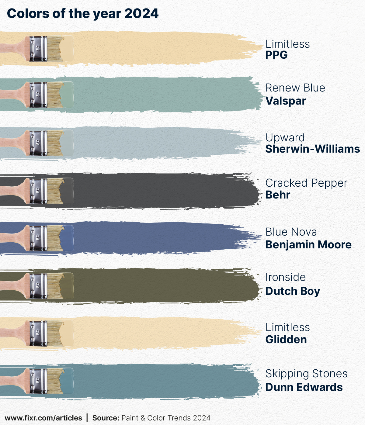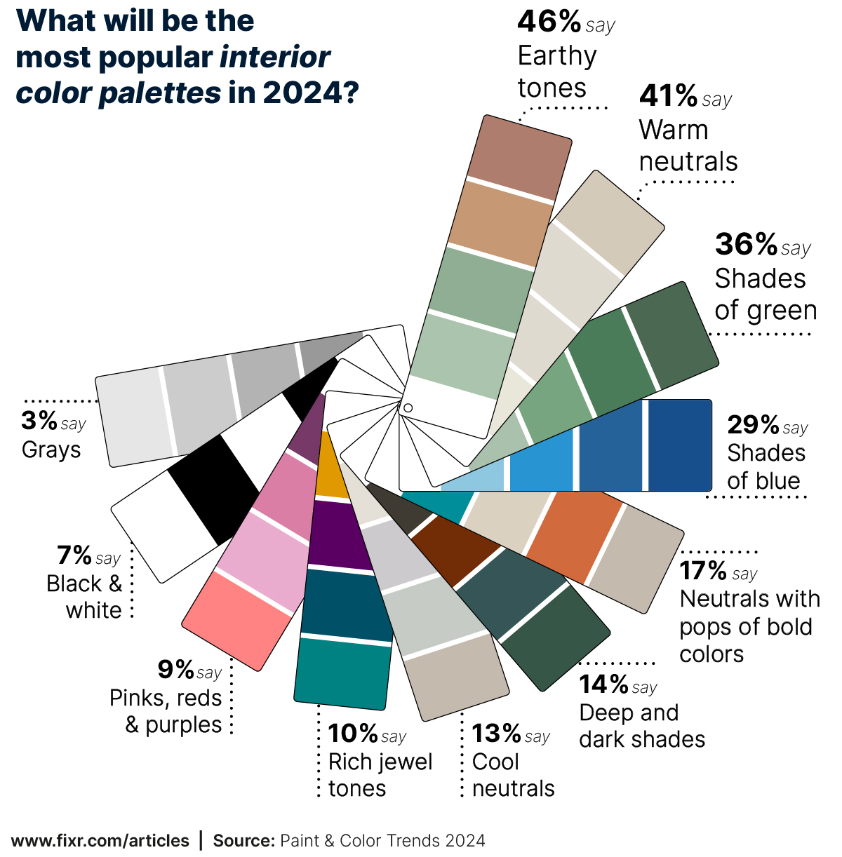 The 2024 Paint and Color Trends Report by Fixr.com highlights a move towards warm neutrals, greens, and blues.