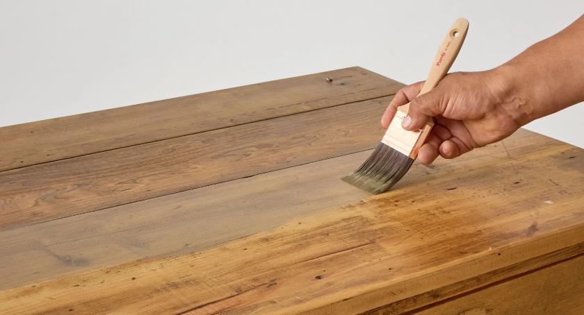 Applying stain in smooth, even strokes with the grain ensures rich, consistent color.